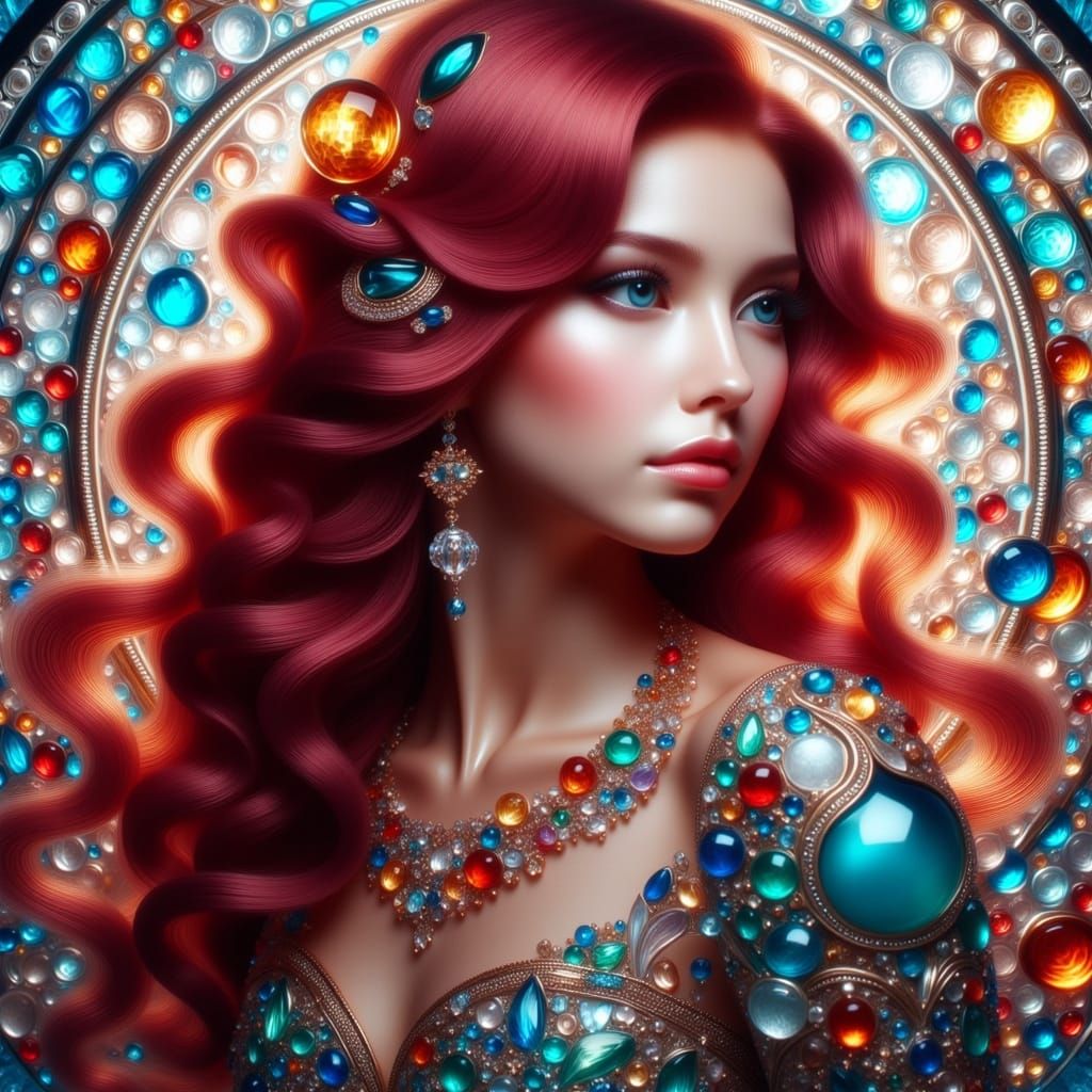 A digital portrait of a beautiful woman with ruby hair and sapphire eyes. Her face is fragmented like stained glass against an art deco background with geometric patterns in a futuristic style.