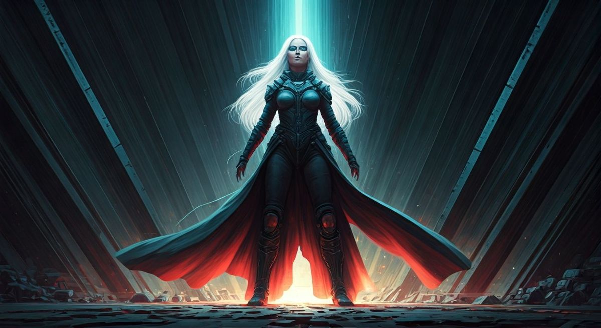 A triumphant white-haired woman stands with piercing blue eyes, commanding the earth. The image features cinematic lighting, industrial typography, and a vibrant color palette.