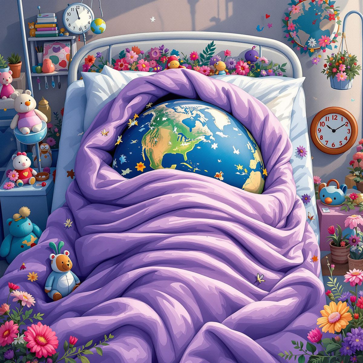 This image depicts planet Earth in a hospital bed, swaddled in a violet blanket and adorned with flowers and toys, symbolizing recovery. Rendered in a whimsical gouache style with delicate textures.