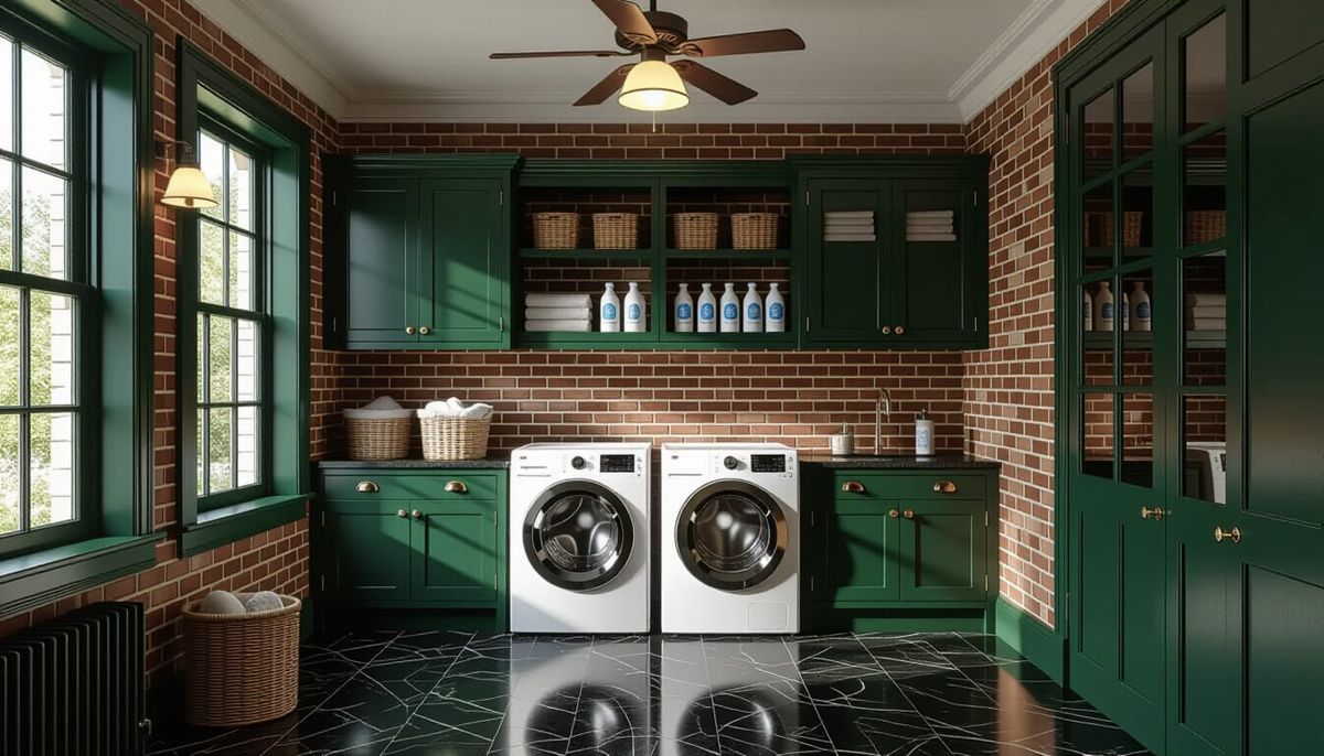 This image showcases a meticulously organized Victorian laundry room featuring dark green cabinetry, a glass wall, and polished black marble floors. Detailed architectural illustration style with atmospheric lighting.