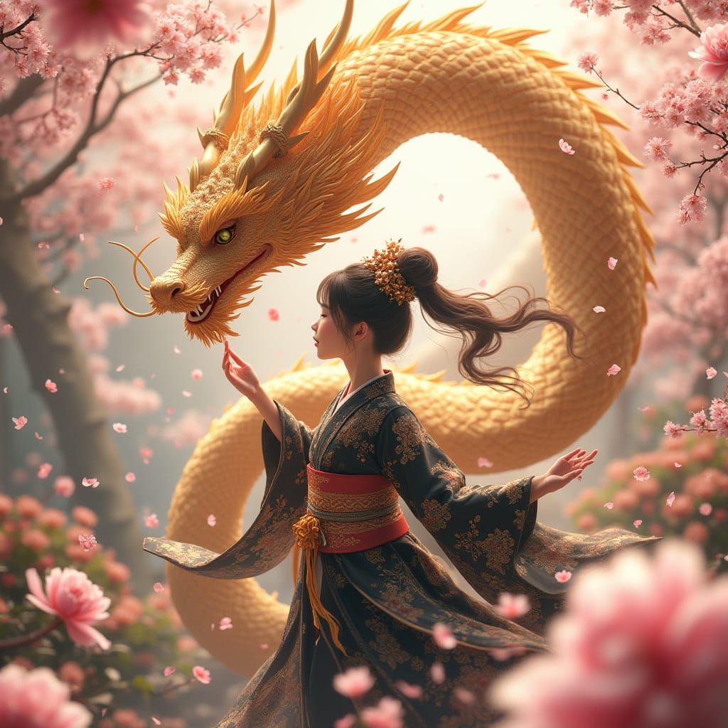 This image shows a girl in a kimono dancing in a garden as a golden dragon soars around her. The image is reminiscent of 3D anime art with ultrafine details, in a WLOP and Genshin Impact-inspired aesthetic.