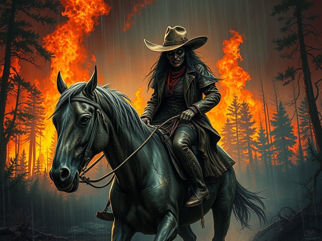 A haunting image of a rotting zombie cowgirl, clad in a tattered coat and cowboy hat, rides a decrepit horse out of a burning forest, set against a low-light backdrop, with rich, contrasting colors and insane detail.