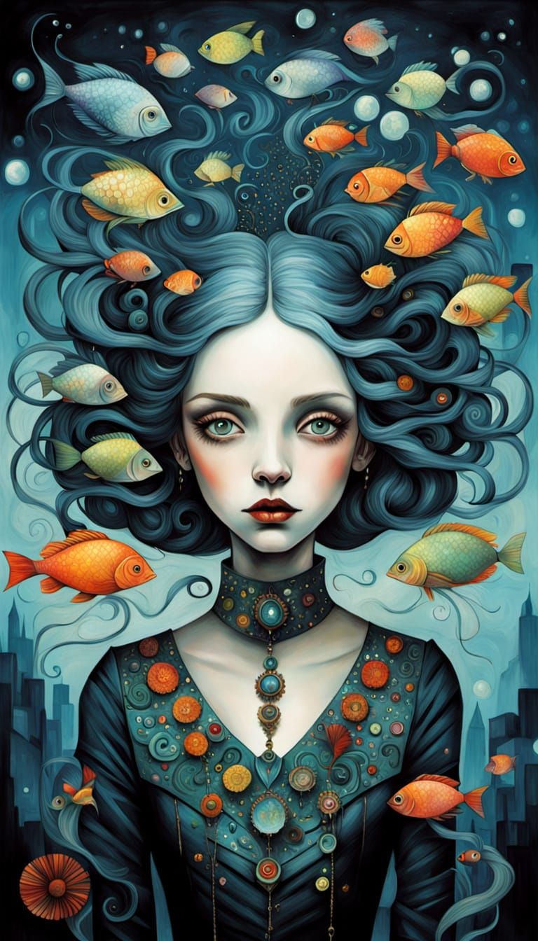 A striking picture of a girl in art deco dress riding a large, colorful fish through the sky. The scene evokes a dreamlike, surreal aesthetic with vibrant colors and deep shadows.