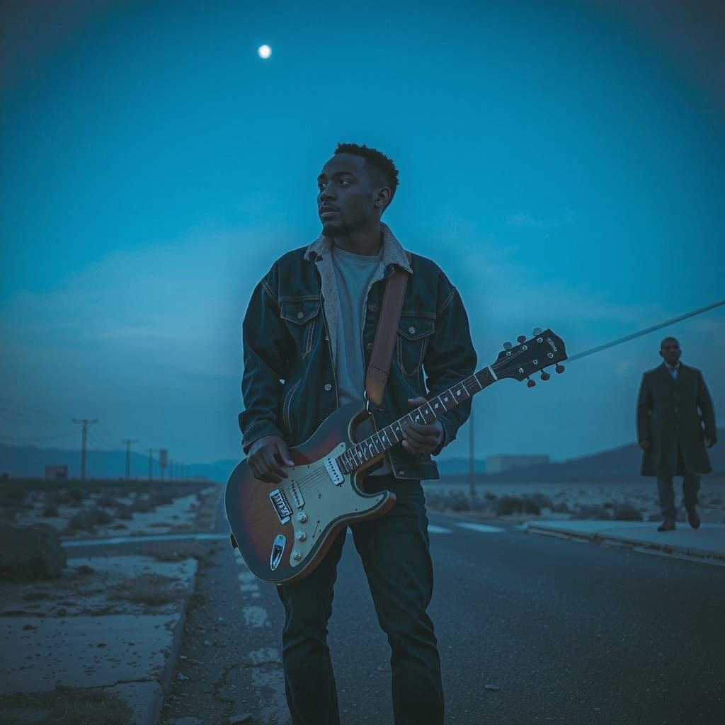 This image shows a young Black man with a guitar at a crossroads. The scene, rendered in dark blues and purples, evokes a sense of foreboding film noir aesthetic.