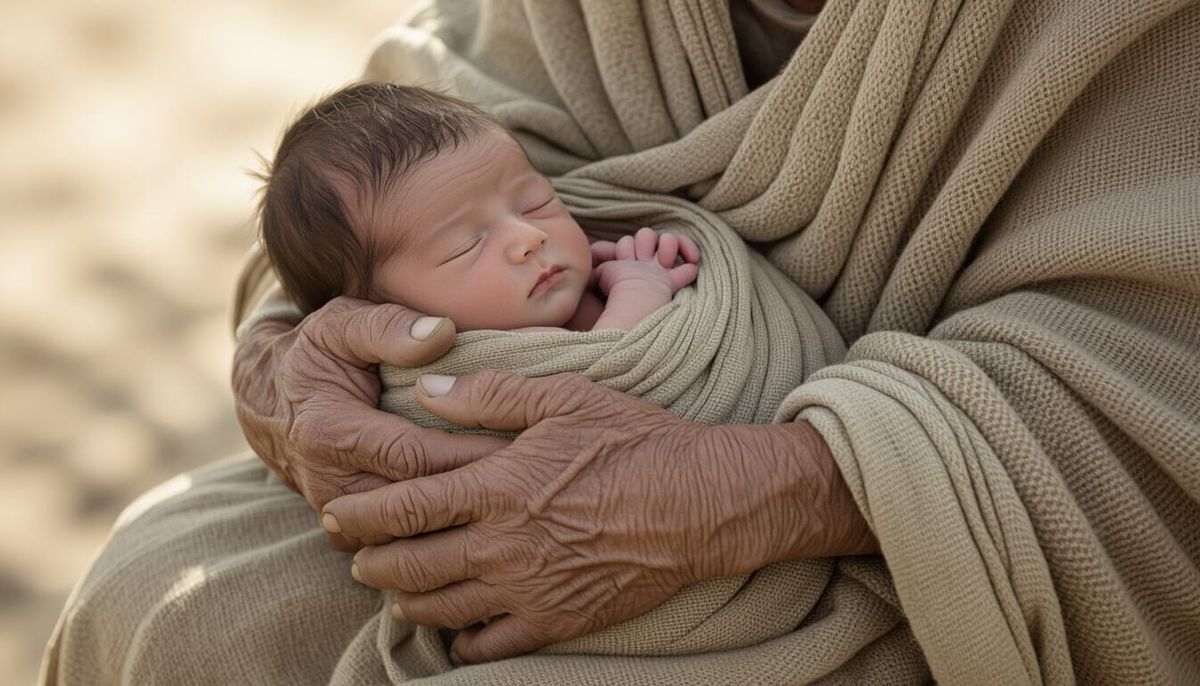 A touching image showing weathered hands holding a newborn baby. The photo captures the contrast between aged skin and the infant's softness in natural light. The style evokes hyperrealism.