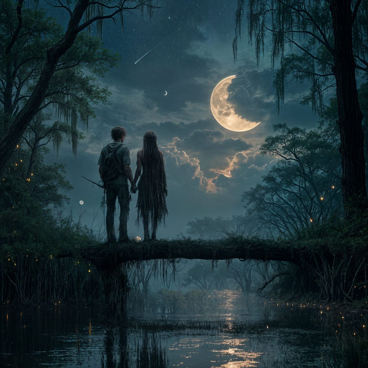 A twilight swamp scene with Spanish moss-draped trees and a sliver of moon. Fireflies illuminate the water, with an aesthetic reminiscent of a post-apocalyptic thunderstorm fantasy.
