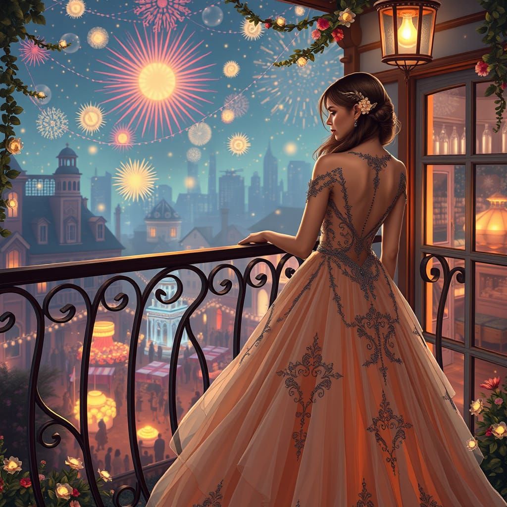 A digital painting of a woman in a ball gown on a balcony with summer air. The artwork is reminiscent of Art Nouveau with Alphonse Mucha inspired details and a touch of James Jean's whimsical style.