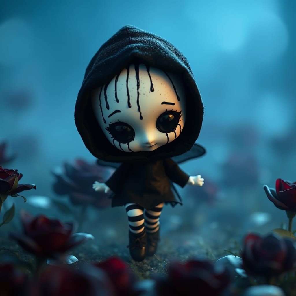 This image shows a charming chibi fairy mime doll with a white painted face and black accents, walking through a misty field of black roses in a dark, gothic aesthetic.