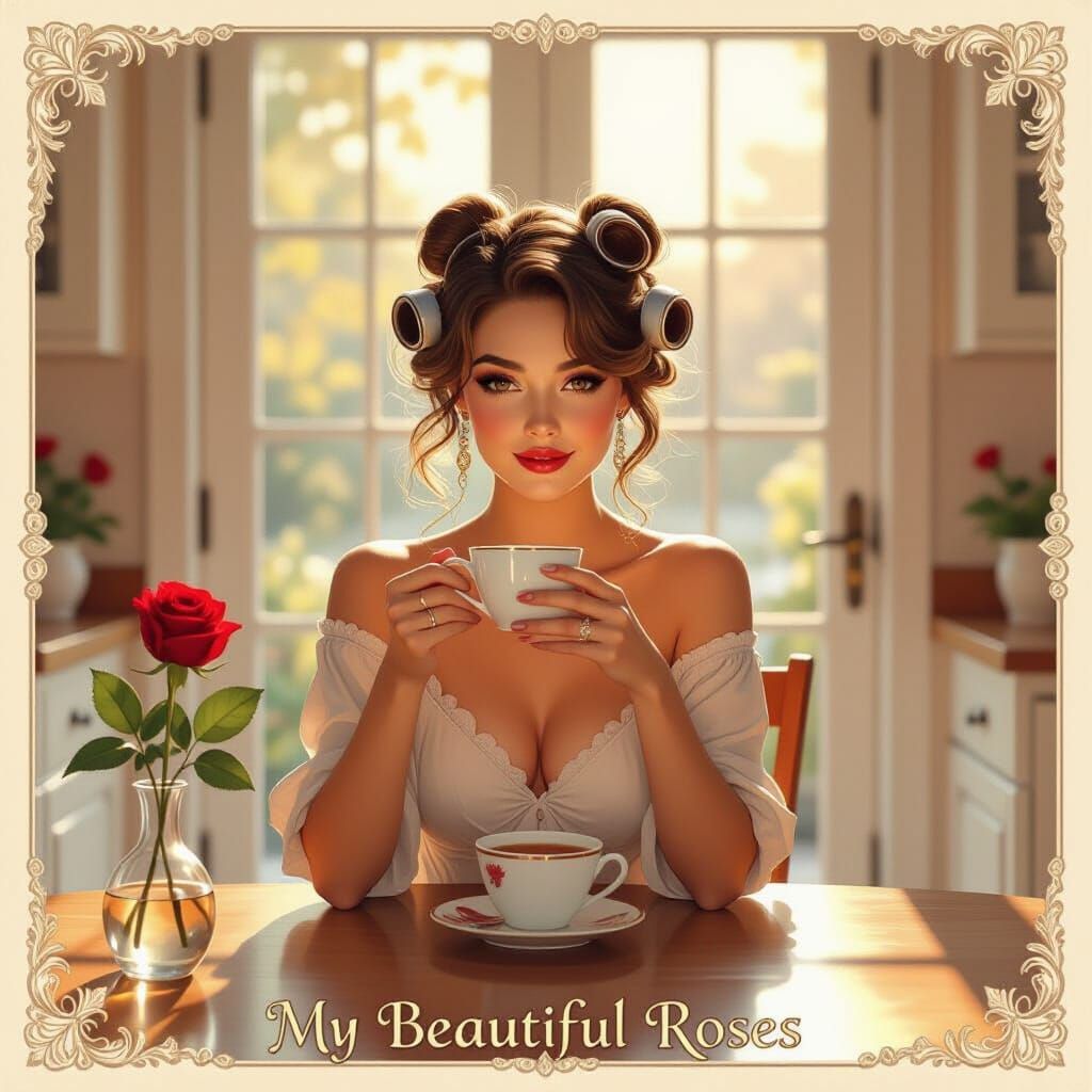 A beautiful woman with hair rollers enjoys tea at her kitchen table one Saturday morning. The sunlit scene features warm lighting, a red rose, and art nouveau design elements.
