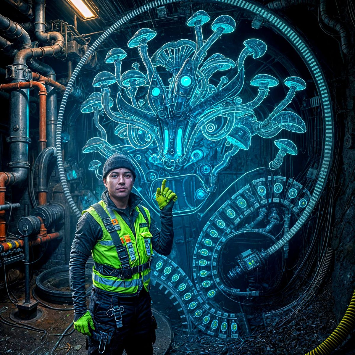 This image shows a dramatic confrontation between a sewer cleaner and a sleek, futuristic AI entity in a dimly lit, industrial setting. Rich textures and atmospheric lighting create a gritty, dystopian atmosphere, blending elements of sci-fi and fantasy worlds.