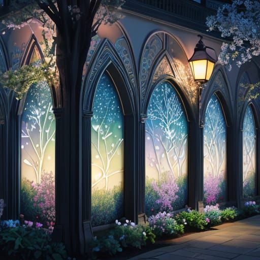 This image shows a tree blooming at night in a garden. Dew drops glisten on the smooth, curved branches. Art Nouveau elements are present with glowing floral patterns and pastel colors.