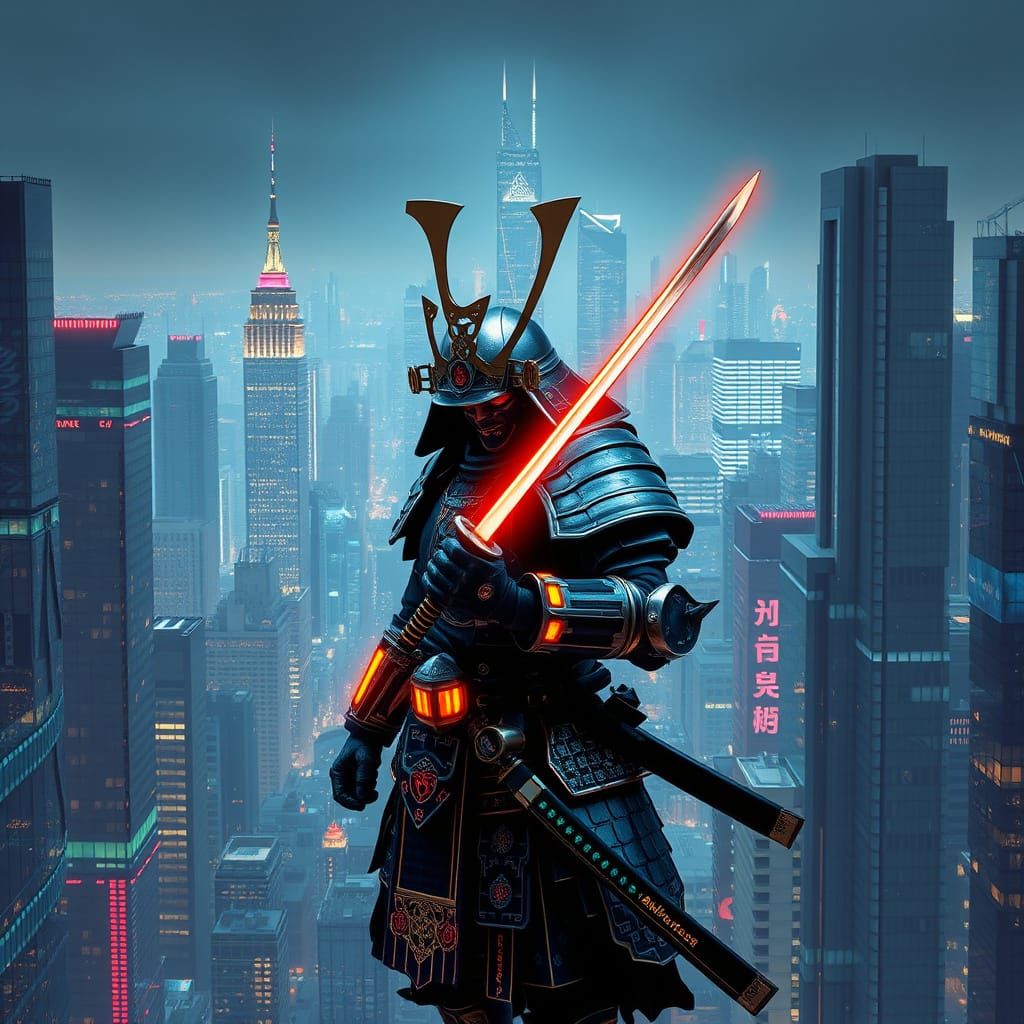 A technologically-enhanced samurai warrior stands proudly, clad in metallic armor with glowing neon accents, amidst a vibrant cityscape of towering skyscrapers and neon lights.