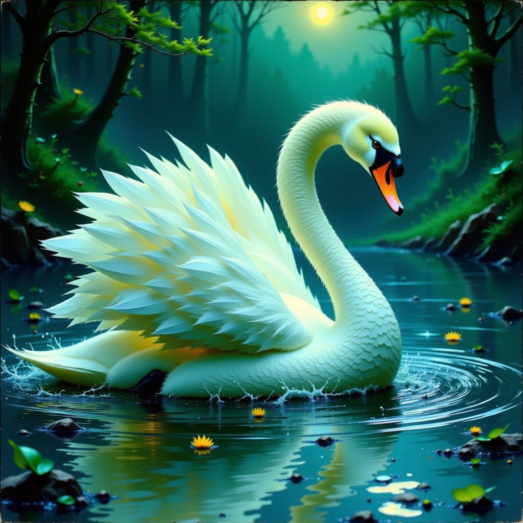 This image shows a majestic swan swimming on a lake at night. The artwork features iridescent colors and flowing lines, reminiscent of art nouveau fantasy art.