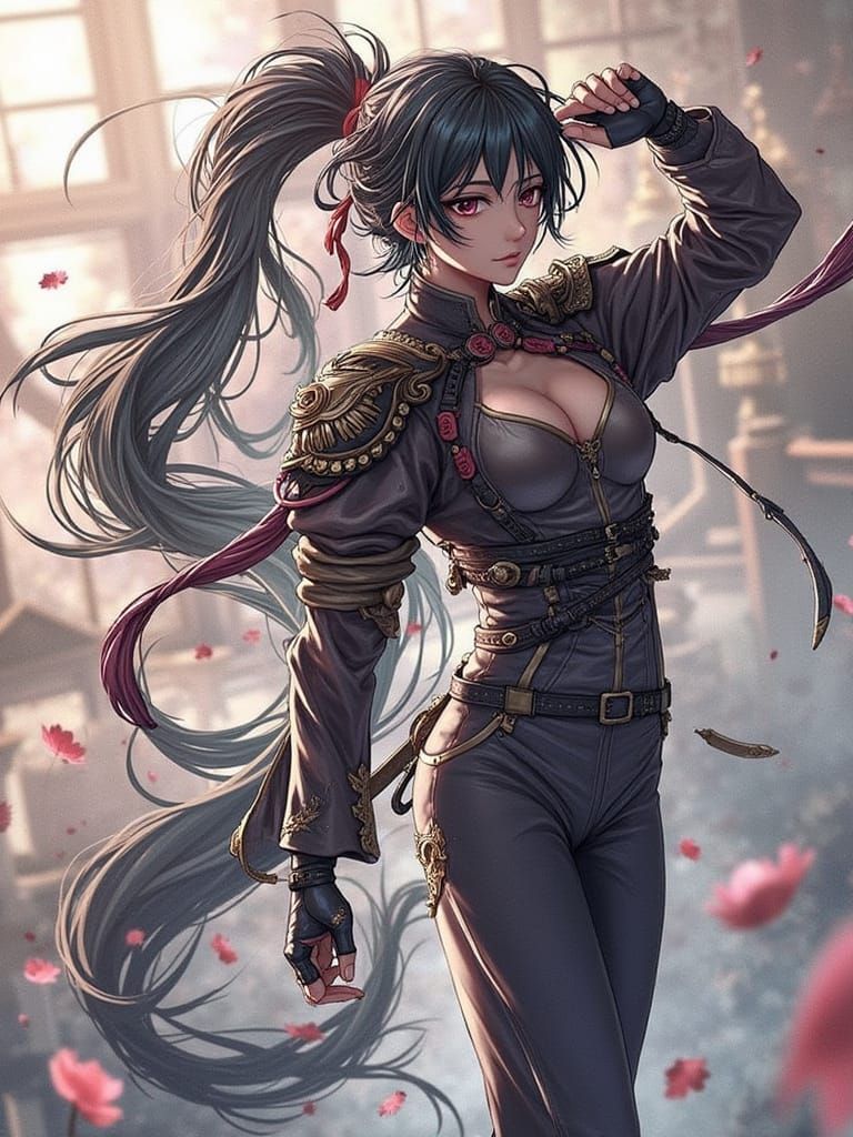This image showcases a detailed 3D anime character in a dynamic pose. The artwork features vibrant colors and expressive lines, with intricate clothing and accessories. Rendered with exceptional detail, in a 3d anime aesthetic.