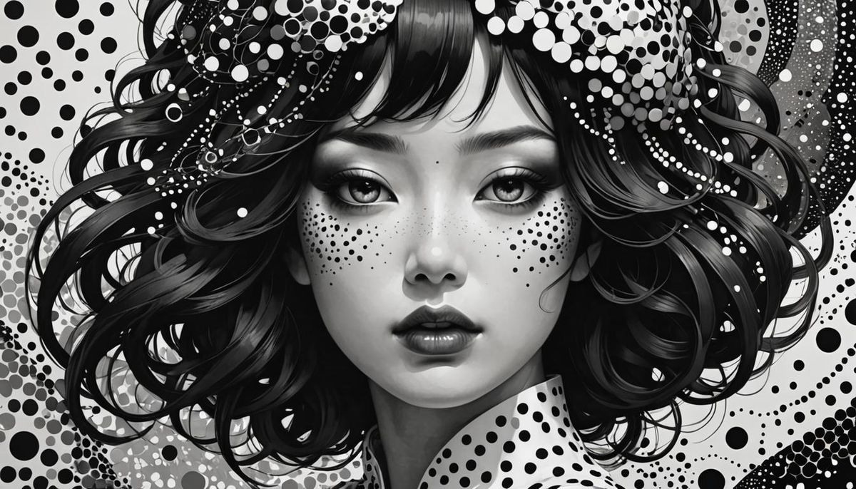 A portrait shows a face composed of tiny dots in monochrome colors. Abstract curves suggest infinite perspective in an artistic style reminiscent of manga art.