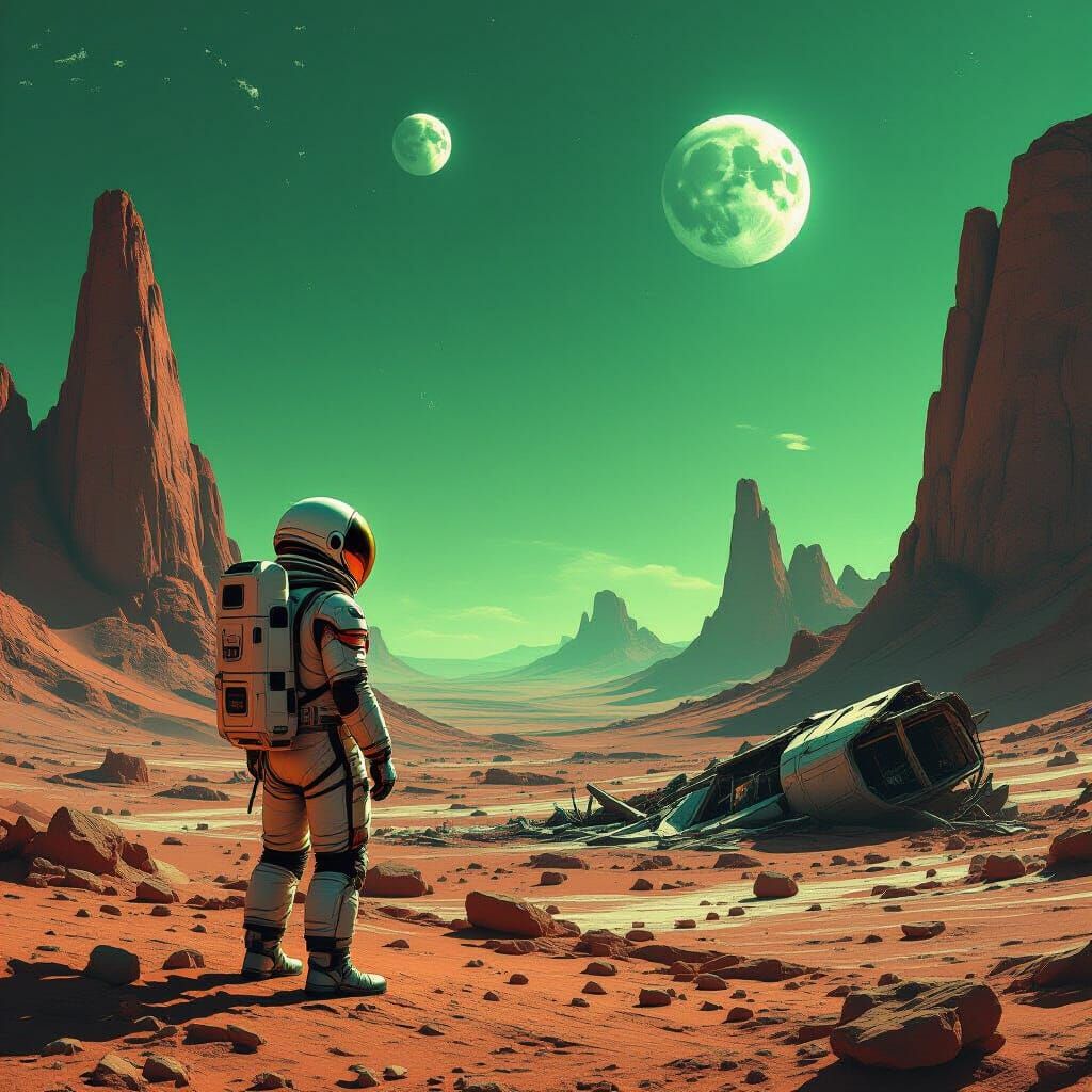 This image shows a lone astronaut on an alien planet, standing before a crashed spaceship. The barren landscape and sickly green sky enhance the sense of isolation and despair, with a cosmic horror aesthetic.