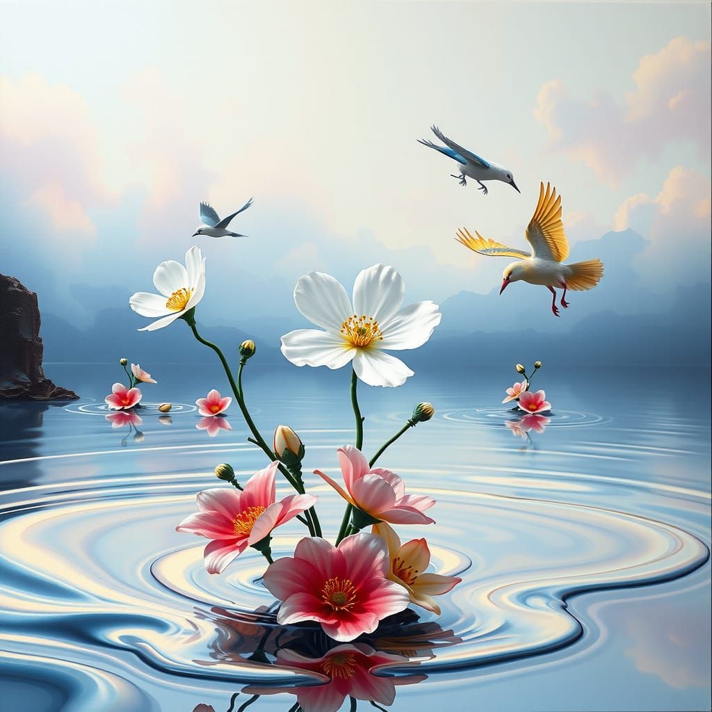 A surreal picture of crystal flowers blooming on a lake of liquid silver. Glassy birds pose against a matte background, rendered as melting oil on canvas, with cool colors and volumetric lighting.