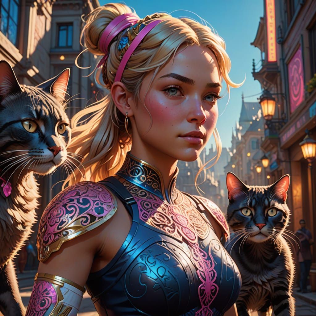This stunning portrait shows a young girl in a dynamic pose, crossing the finish line in a Bionic-inspired leotard, with a cheeky black and white cat watching in the background. The artwork features intricate details, triadic colors, and dramatic shadows, creating a masterpiece that blends Artgerm's styl...