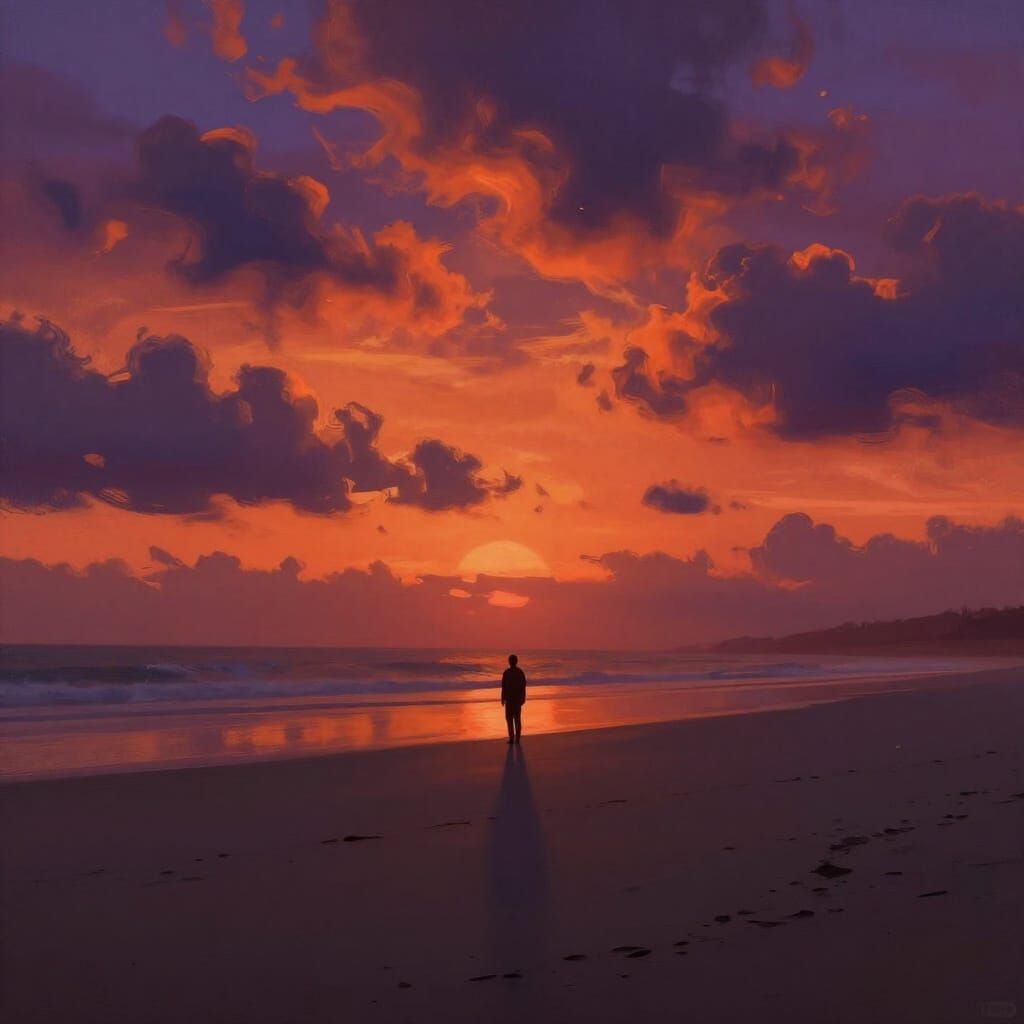 This image depicts a lone person on an expansive beach at twilight, silhouetted against a vibrant, fiery sunset sky. Rendered in a dramatic digital painting style with atmospheric lighting and painterly textures.