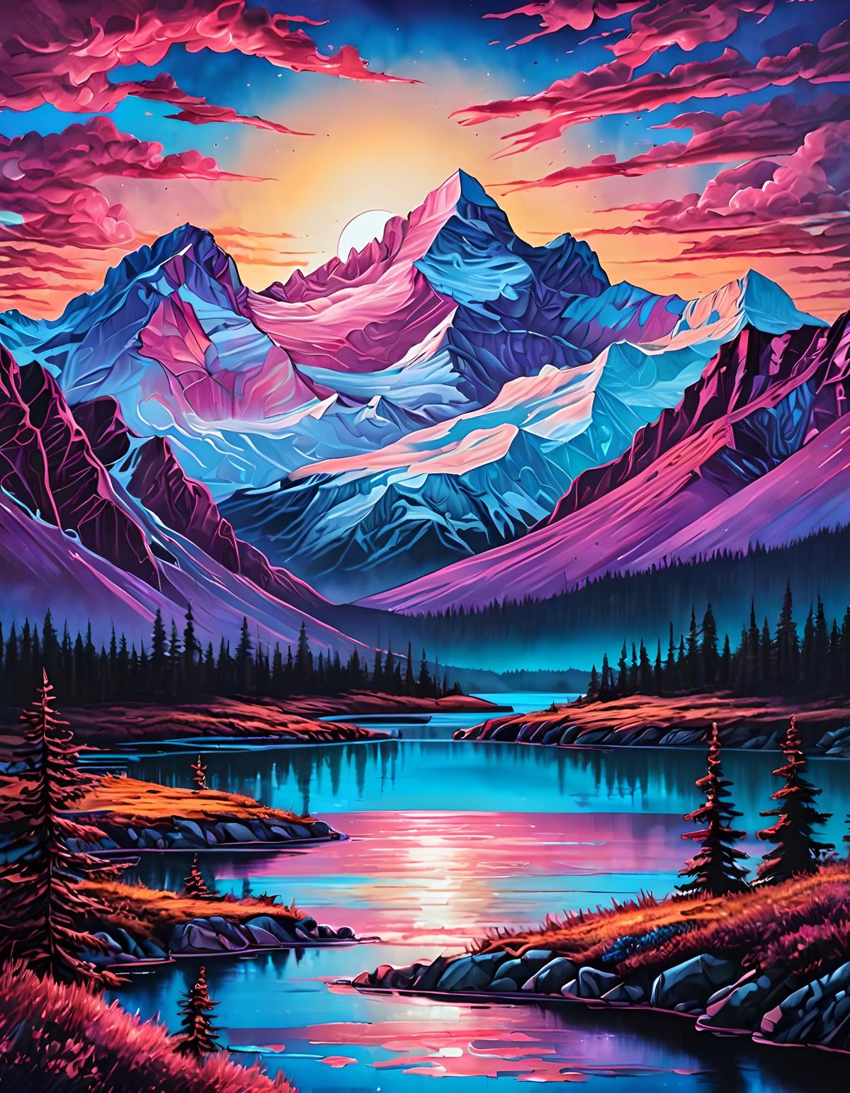 A vibrant image of a sunrise over the Canadian Rockies, rendered with metallic inks in a vaporwave aesthetic. The artwork evokes the style of classic oil paintings.