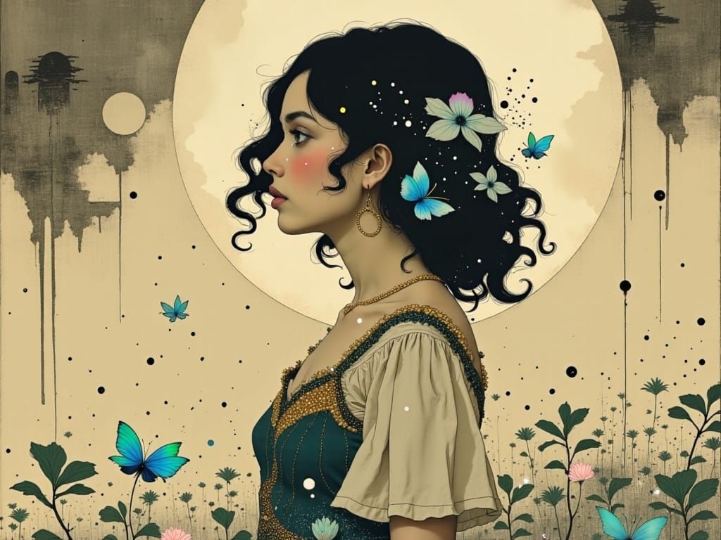 This enchanting image depicts a young woman in a flowing, beaded flapper dress, surrounded by Art Deco architecture, amidst whispering winds in a moonlit garden. Her style is a fusion of classic and modern elements, evoking a sense of wonder and playfulness.