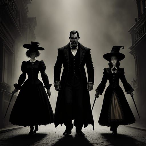 This image depicts three classic monsters on Halloween night, walking down a detailed Victorian street. Moody lighting with deep shadows and orange glows enhances the atmospheric horror.