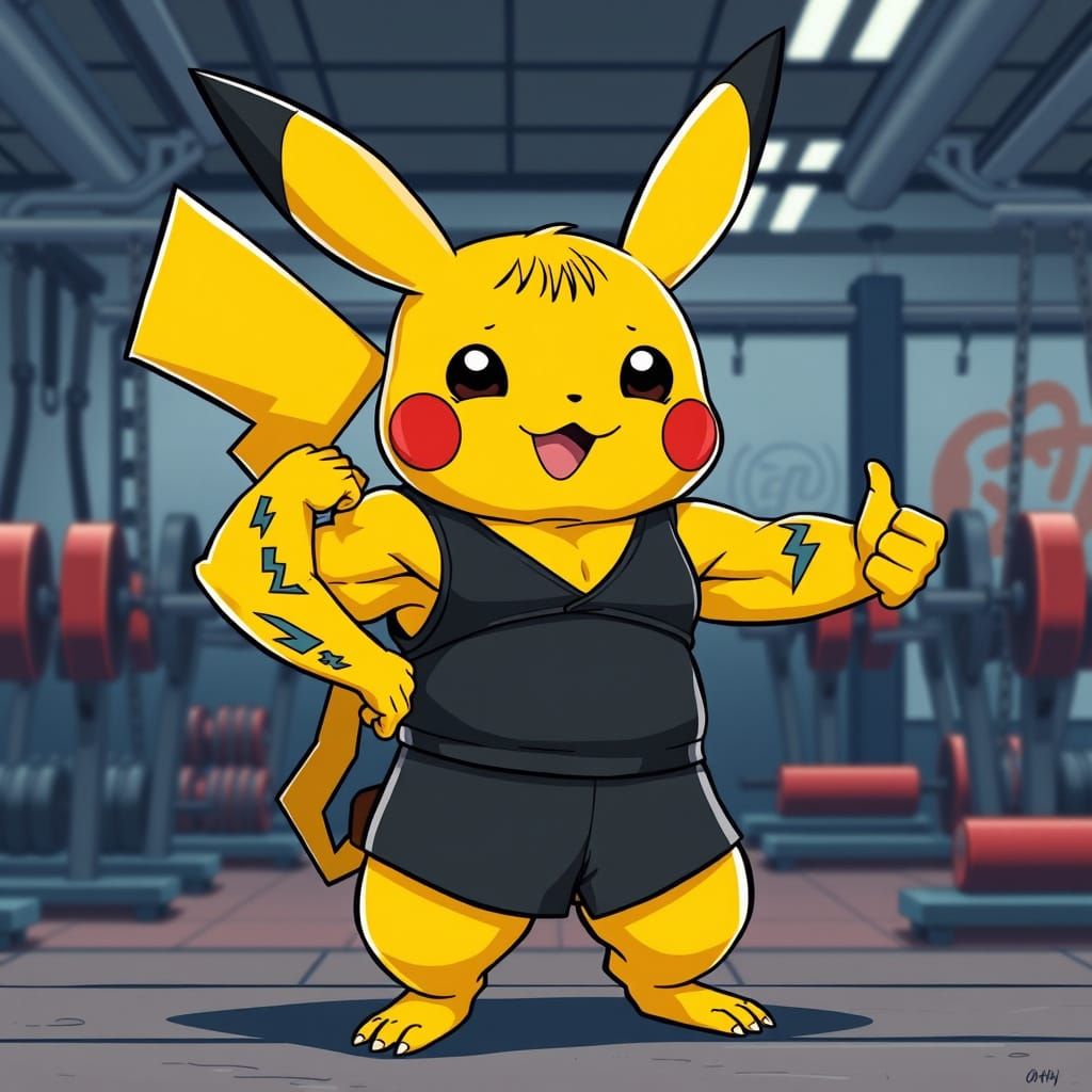This image shows a muscular Pikachu in gym attire striking a bodybuilder pose. The cartoon art style features bold lines, bright colors, lightning bolt tattoos, and humorous details.