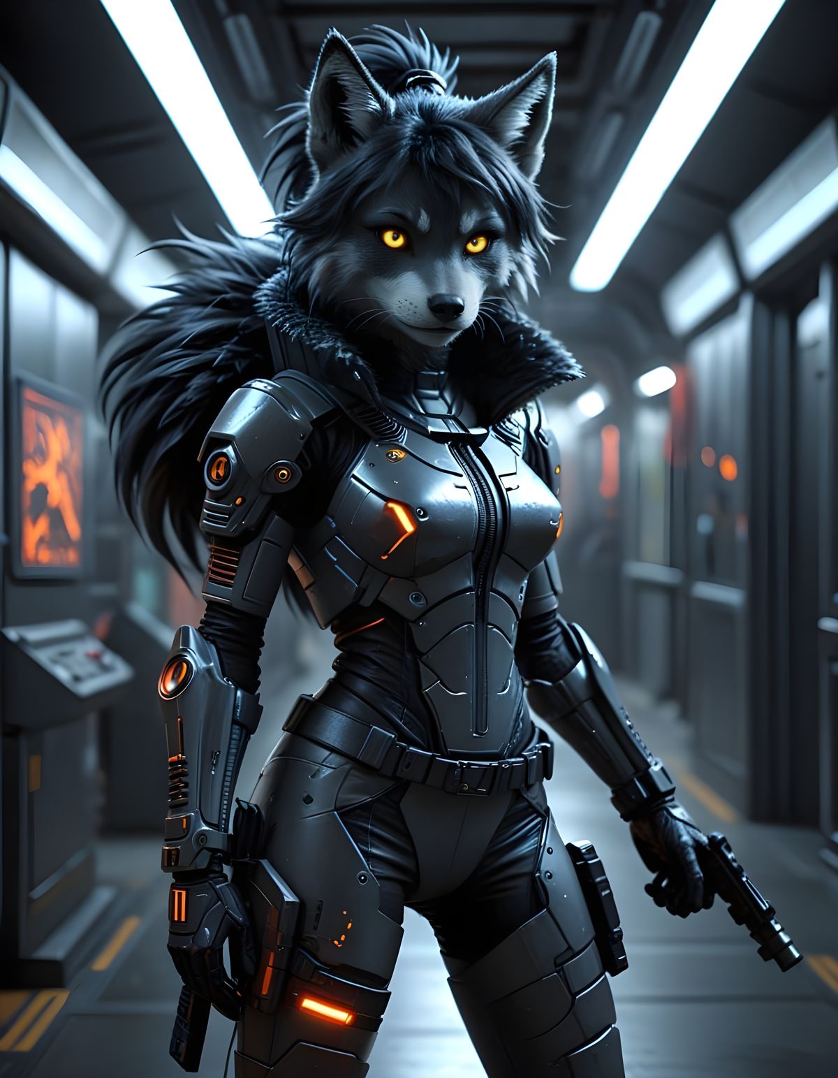 A striking anime-style image of a wolf-female mechanic, dressed in sci-fi gear, holds a glowing phaser gun, set against a darkly vibrant space-ship interior background, showcasing bold lines and expert shading.