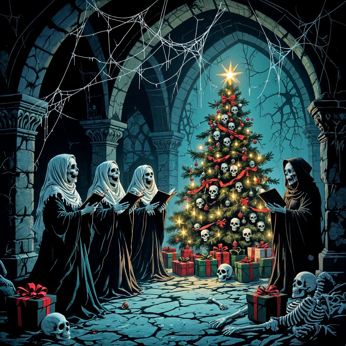 This image depicts a dimly lit crypt decorated for both Christmas and Halloween, featuring undead carolers, haunted gifts, and a skull-adorned tree. Rendered in a dark, atmospheric style with macabre lighting.