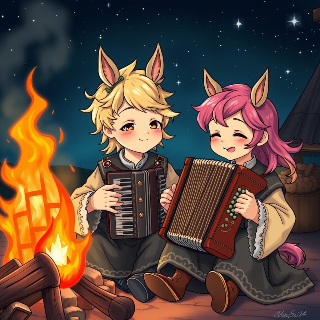This image shows two endearing boys with horse ears, dressed in intricately detailed 13th-century Russian costumes, sitting by a warm fire under a starry night sky. The boy playing the accordion fills the air with lively music, depicted in a vibrant anime style with bold lines and bright colors.