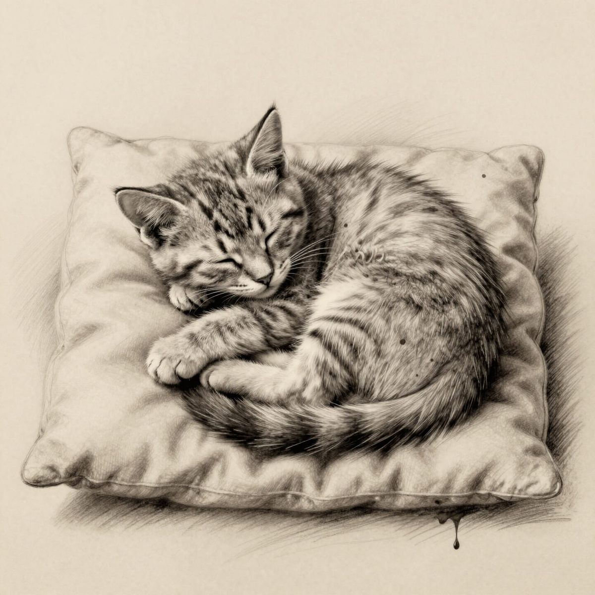 This image is a 3D charcoal drawing of a kitten sleeping deeply on a pillow. It features fine pencil sketch lines, monochrome tones, and subtle ink drips.