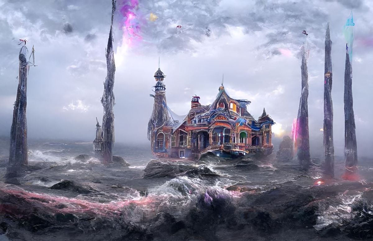 detailed entangled ethereal expansive colorful complex galactic photorealistic tornadic thunderstorm mysterious ominous elemental stormy night on the ocean with beautifully lit victorian houses on the shore