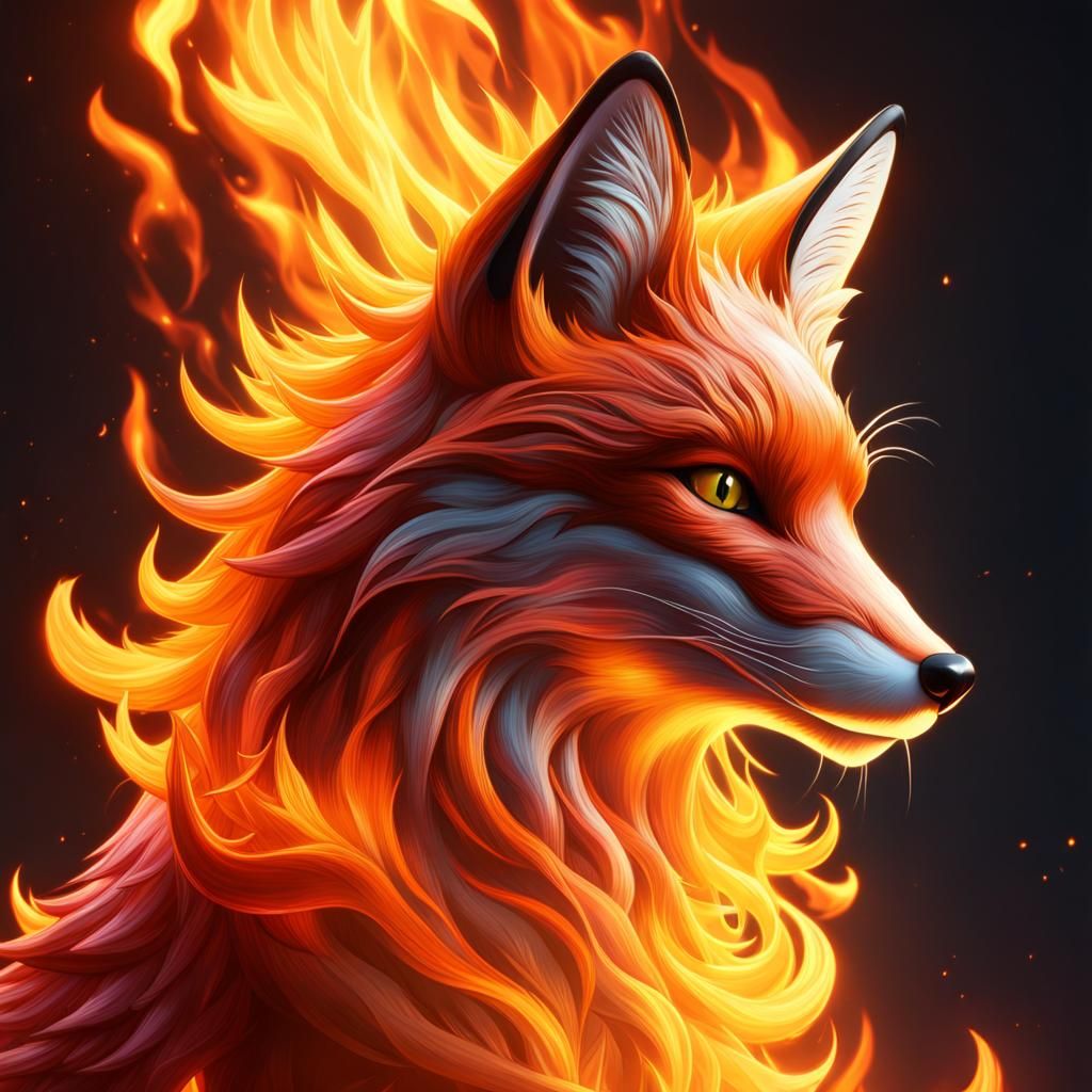 This image shows a fox composed of fire and flames. The artwork is rendered with dynamic lighting and intricate details in a dark fantasy concept style with red, yellow, and orange complementary colors.