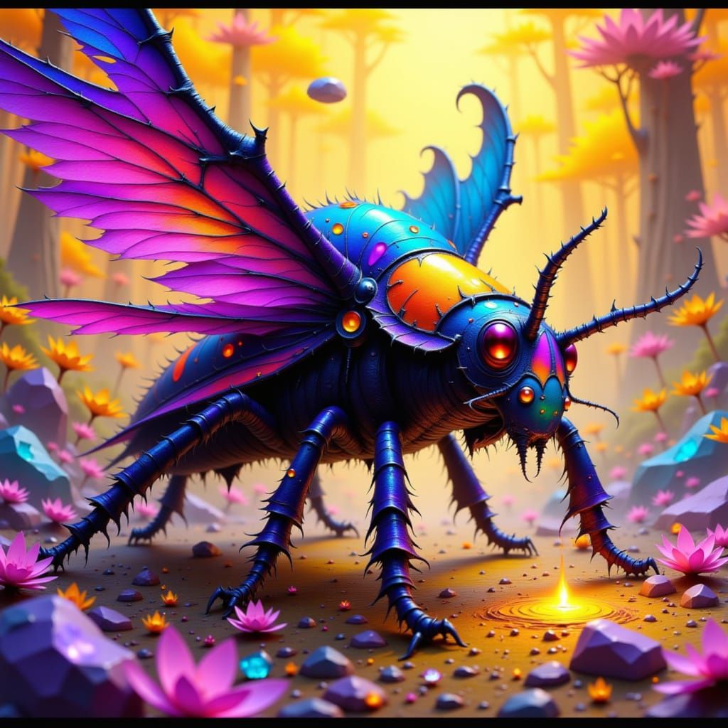 This image shows an anthropomorphic scarab beetle with human features in a vibrant 3D anime art style. It features dynamic lighting and hyperdetailed textures against a bright radial gradient background.