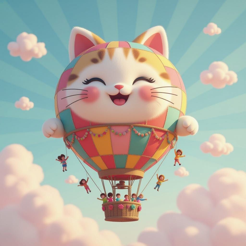 This image shows a giant cat-shaped air balloon floating in a pastel sky. Miniature passengers wave from tiny baskets, rendered with intricate details and a bright gradient background in a whimsical Disney-Pixar style.