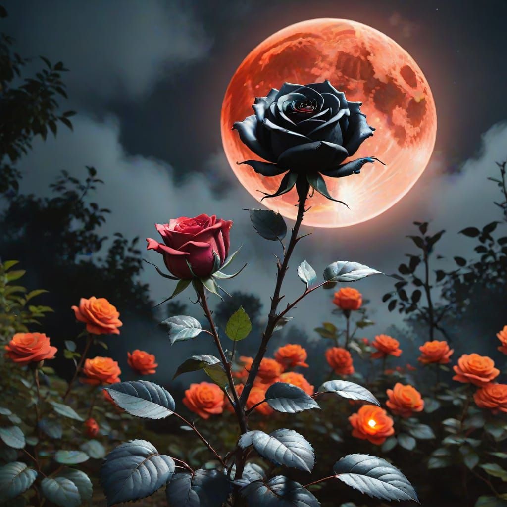 A striking image of a giant black rose engulfed in flames within a magical garden, illuminated by a full blood moon. The scene evokes a dark fantasy aesthetic.