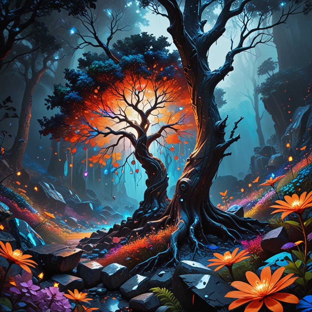 This image showcases a glowing, mystical tree in a vibrant surreal forest with colorful flowers and rocks. It features dynamic splash art with triadic colors and volumetric lighting.