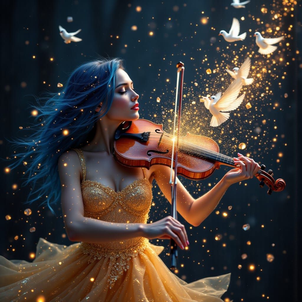 This image shows a woman with sapphire hair playing a violin, surrounded by doves and cosmic light. The surreal crystalline style features luminous shards and dramatic lighting, creating a dreamlike, ethereal symphony.