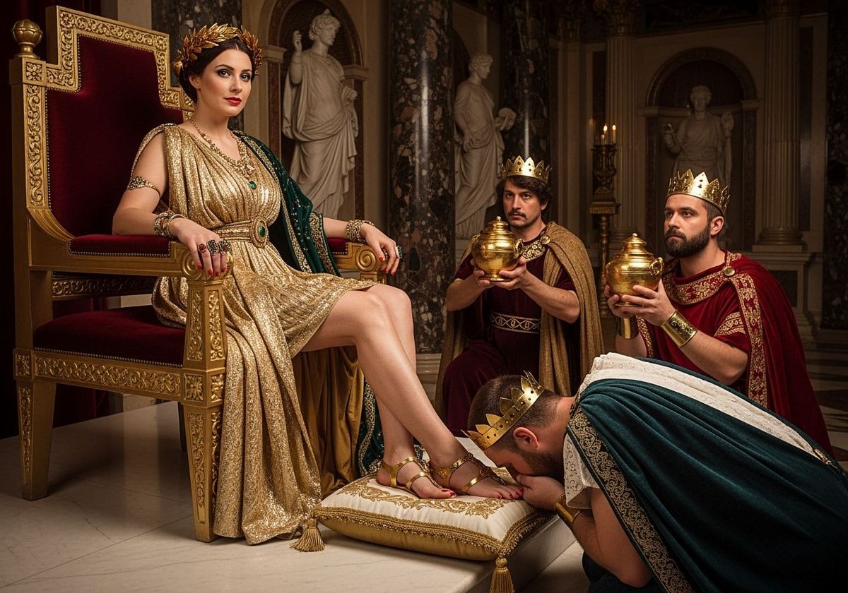 This image shows a Roman Empress on a golden throne, attended by kneeling kings bearing gifts. The scene is set in an opulent palace with marble columns, captured with professional photography techniques.