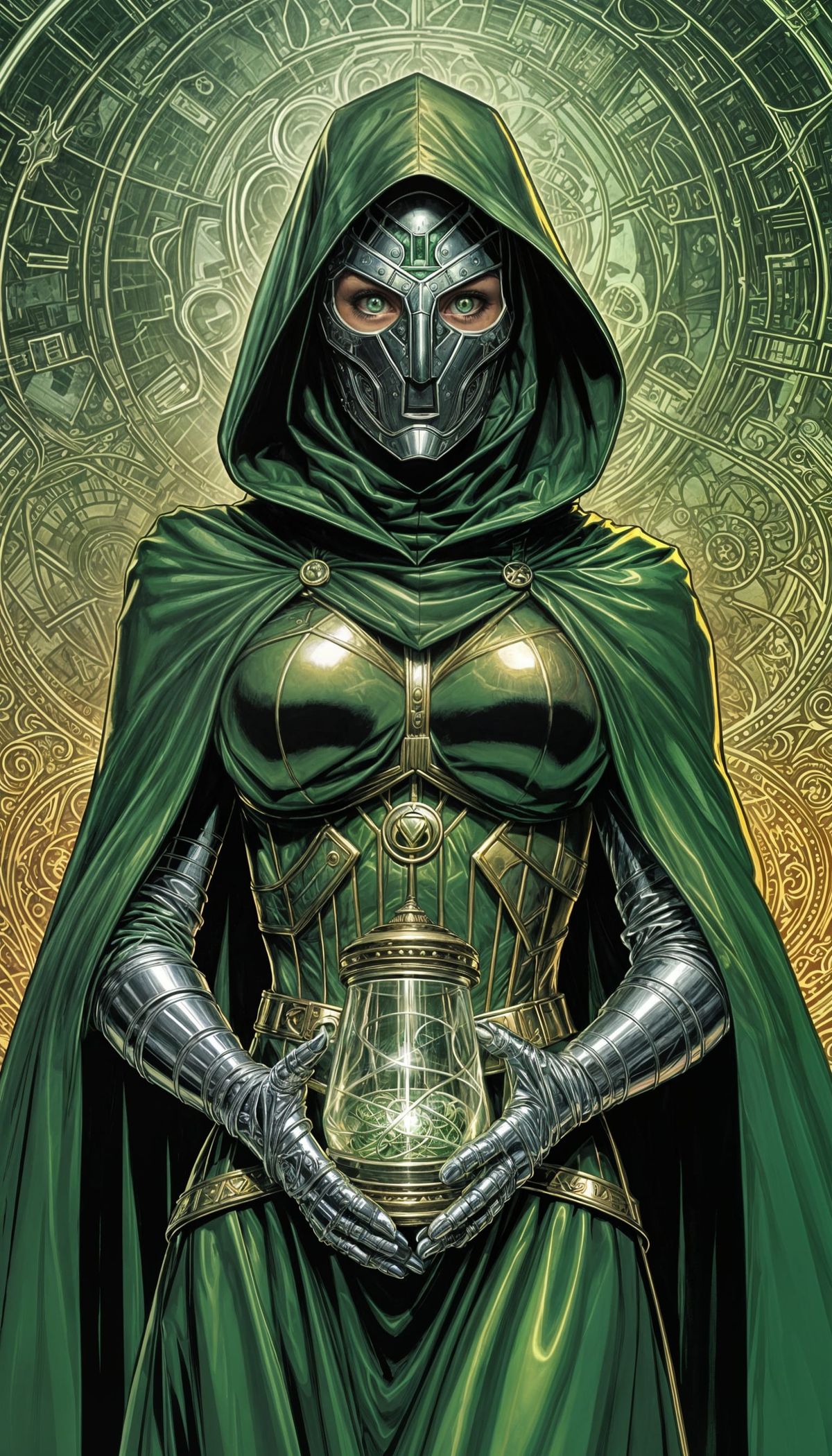 A comic book style rendering of a female Doctor Doom. The character wears a green hooded cloak and a glistening chrome mask, rendered with smooth, intricate detail and exaggerated proportions.