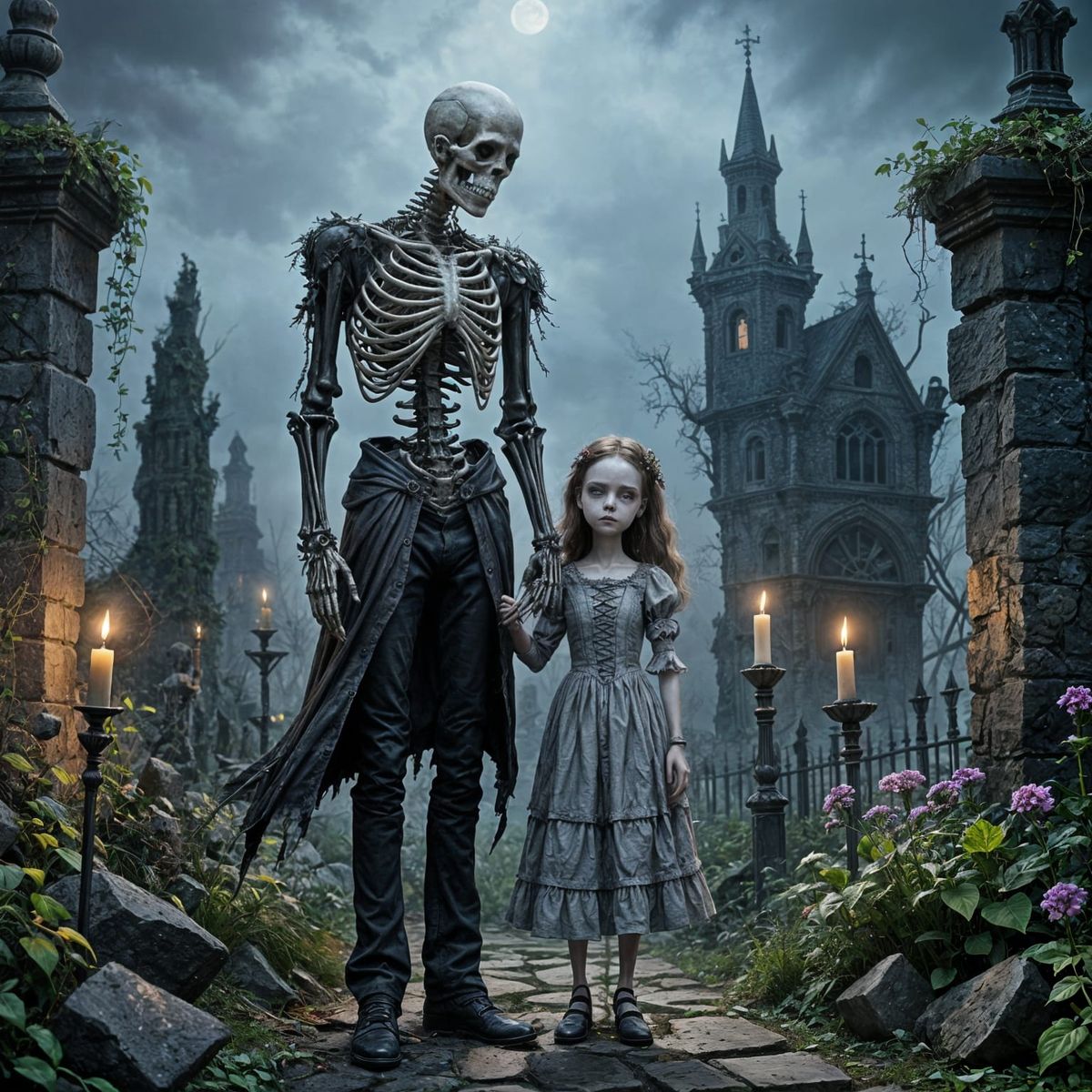 This image shows a skeletal man and doll-like girl in a surreal garden. The gothic scene features crumbling ruins, flickering candlelight and long shadows in a Burton-esque style.