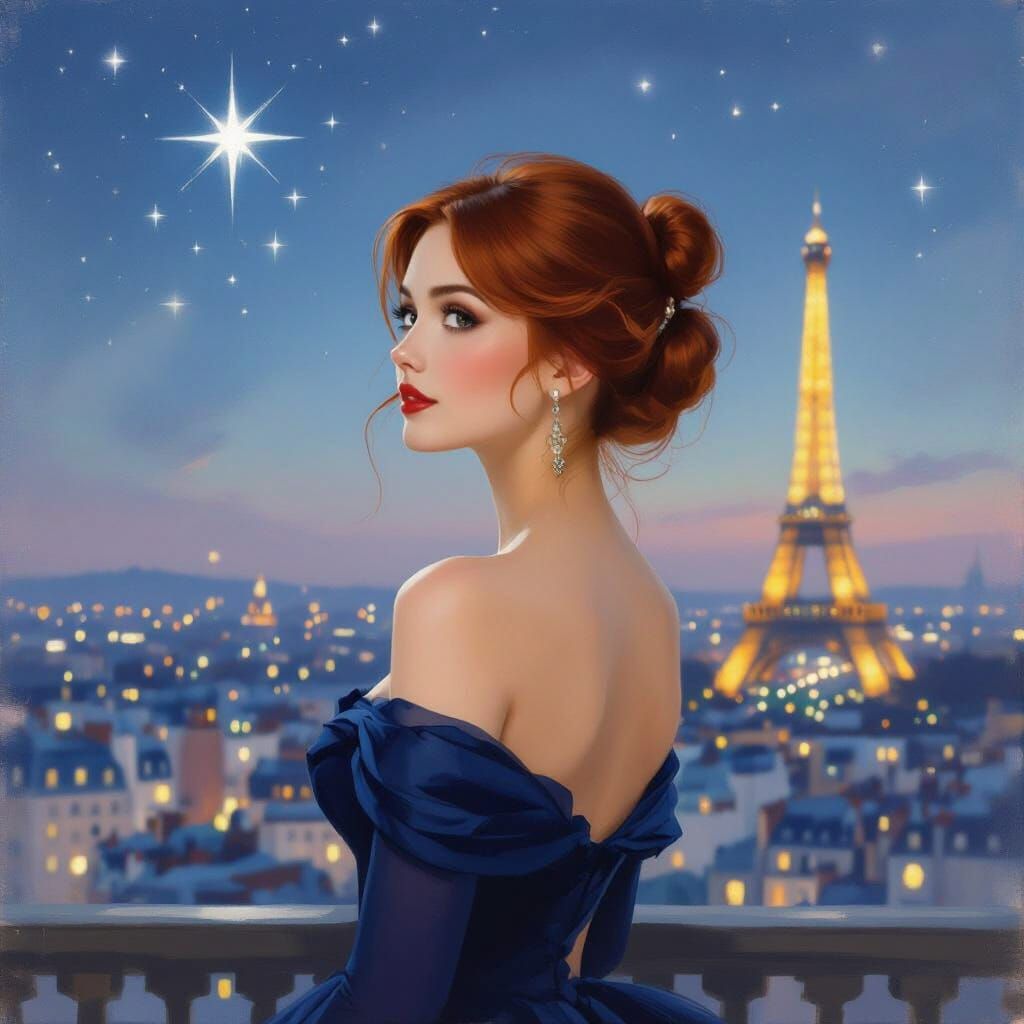 This image shows a beautiful French woman in a midnight blue gown gazing at the North Star over Paris. Rendered in a soft, Impressionistic style reminiscent of Renoir, it evokes a romantic atmosphere.