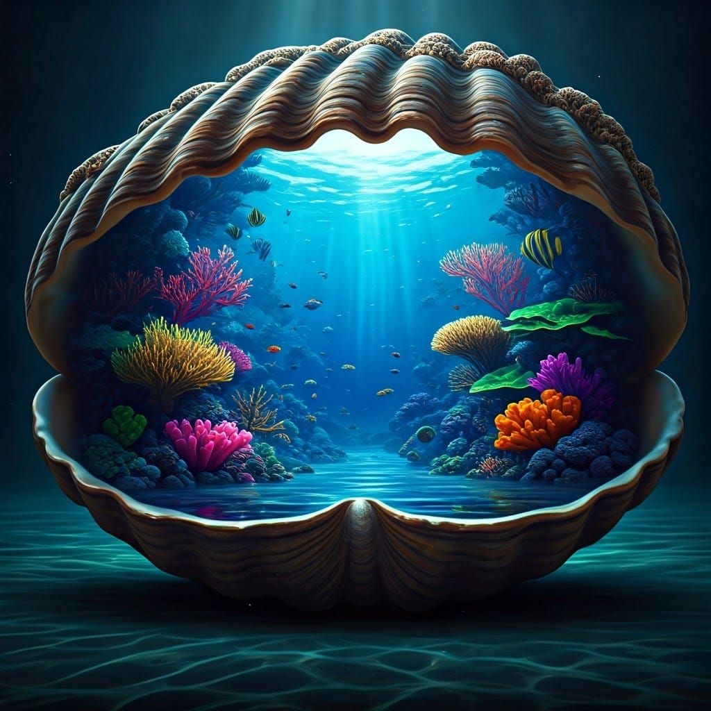 A striking picture of a giant shell reflecting a vibrant underwater ecosystem. Coral reefs teem with life as sunlight filters through the clear water, depicted as detailed fantasy concept art.