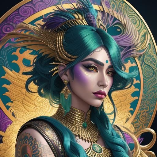 A vibrant digital artwork featuring a beautiful woman adorned with peacock feathers and a metallic, rainbow serpent. The image displays bold, geometric patterns and a shimmering, colorful pop art aesthetic.