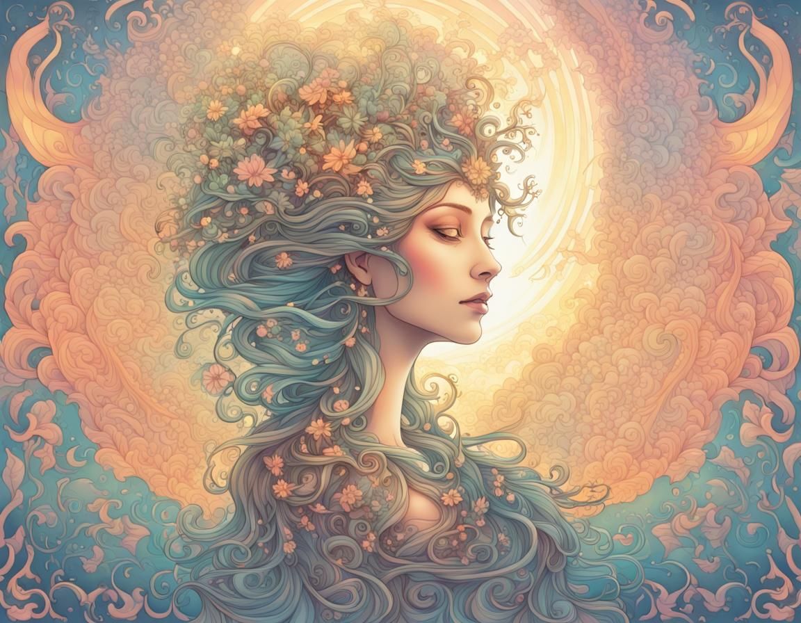 A stunning image of a goddess surrounded by nature, bathed in the light of dawn. This vibrant digital artwork features pastel colors, intricate details, and a fantasy aesthetic.