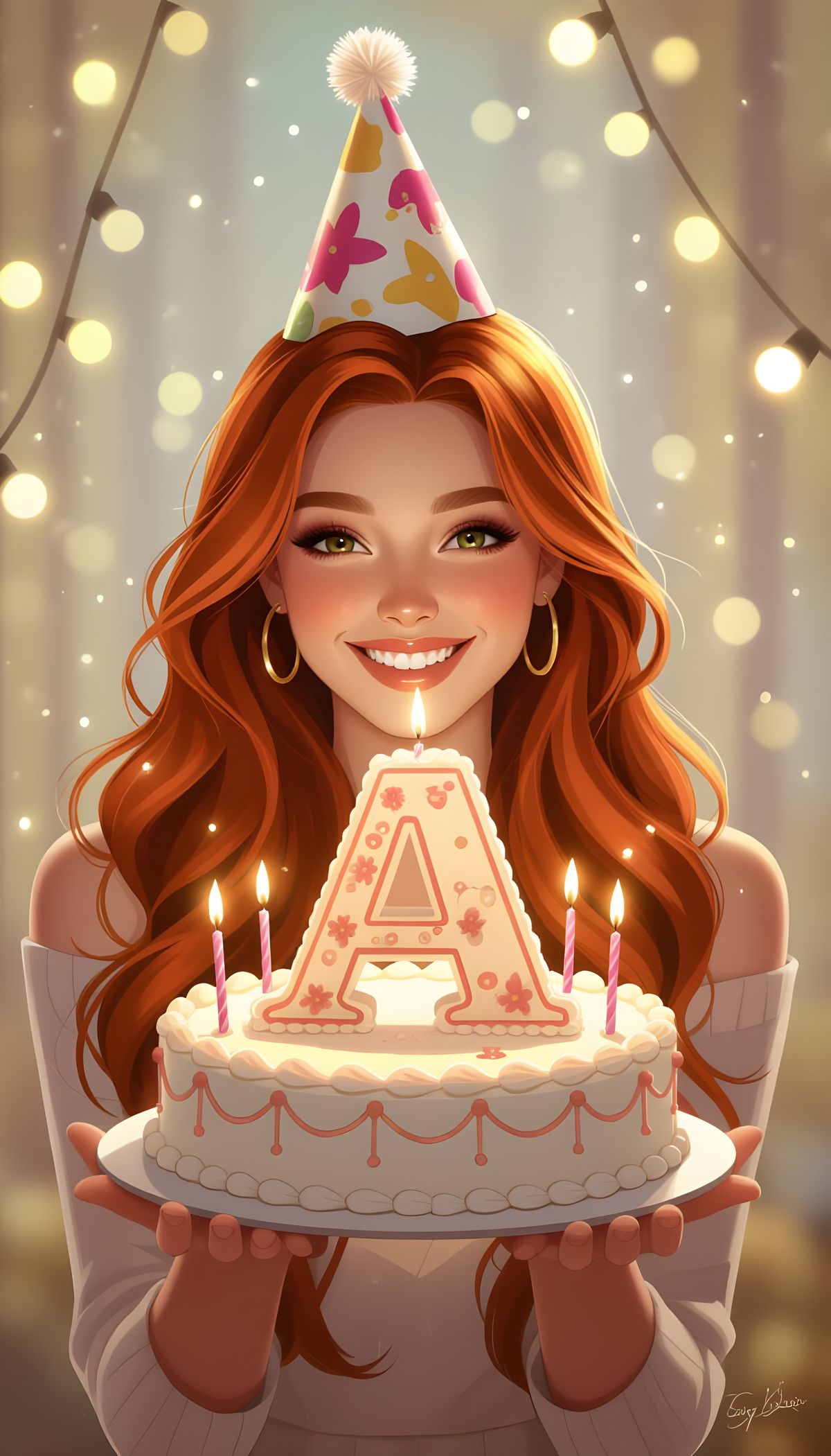 This image features a beautiful girl holding the letter A, perfect for a birthday celebration. The scene is designed to be festive and memorable.
