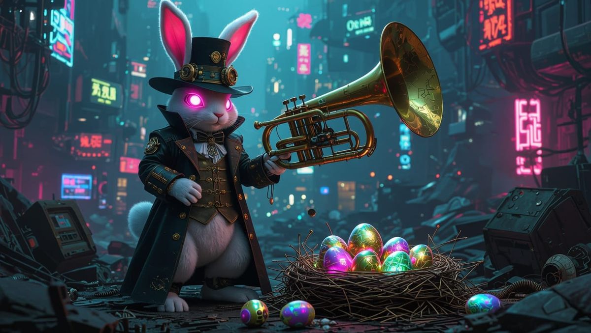 This image depicts a cybernetically enhanced Easter Bunny standing atop discarded machinery, clad in a long duster coat and cyberpunk hat, holding a steam-powered tuba with gear-shaped bell, amidst a nest of gear-crafted eggs reflecting iridescent colors in a dystopian cityscape.