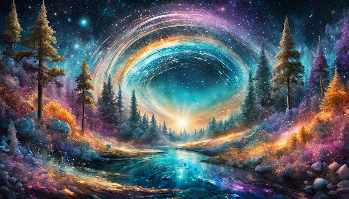 A vibrant forest clearing beneath a starlit sky. The scene features a prism refracting light into a rainbow on the water's surface, enhanced by bokeh and cosmic swirling glitter stardust in an astral illustration style.