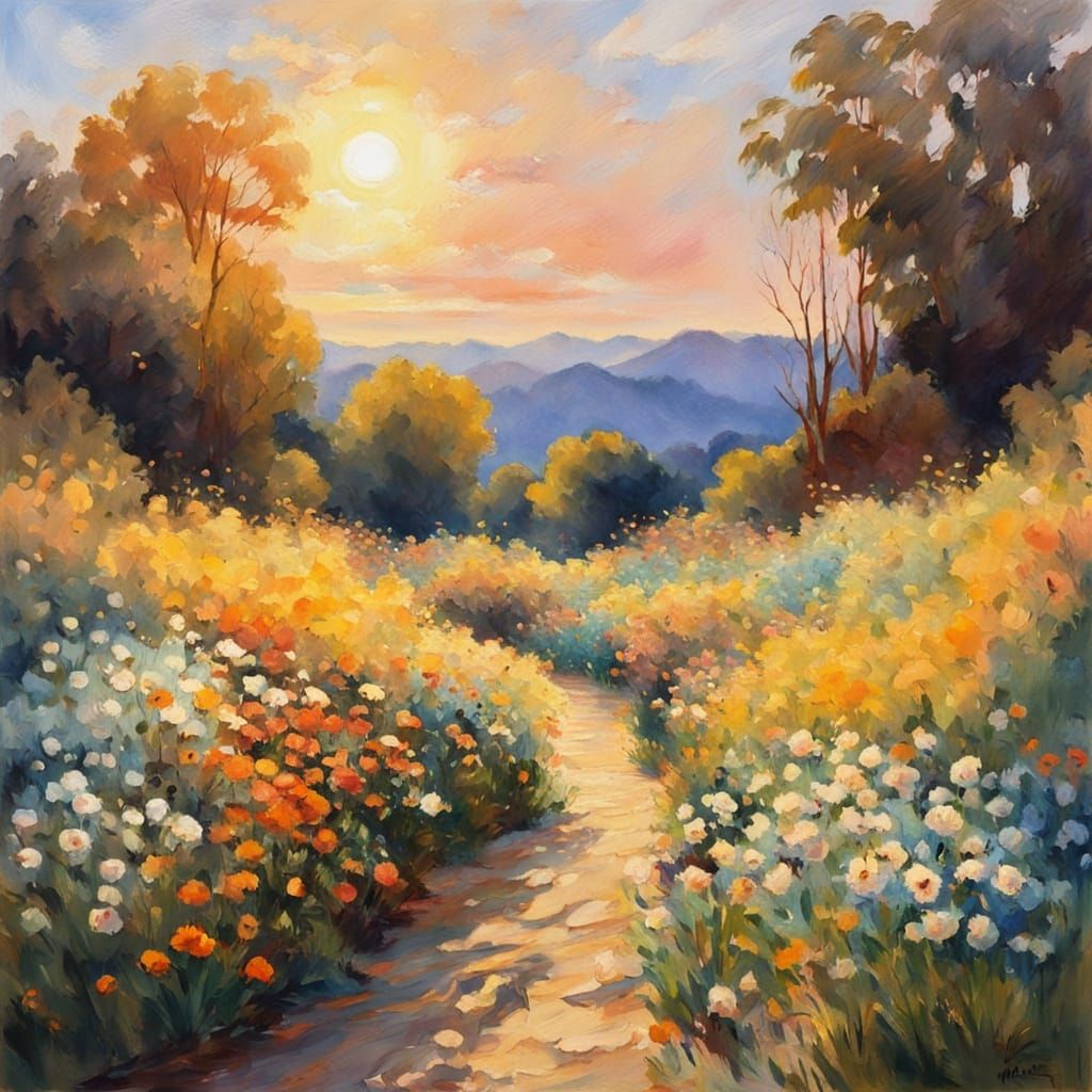 This image shows a serene Easter landscape with blooming flowers and a bright sun shining through fluffy clouds, reminiscent of Impressionist masterpieces with textured, thick gouache watercolors on canvas
