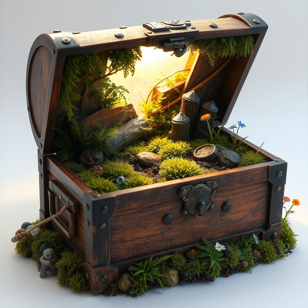 envision a lush miniature forest growing inside a vintage pirate's treasure chest. The chest is overflowing with moss, ferns, and tiny wildflowers, with sunlight filtering through the cracks in the lid, illuminating the scene. The style is a blend of rustic pyrography and magical realism, with rich wood ...